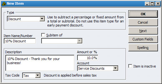 Figure 1: A discount item allows you to create and track percentage or amount based discounts.