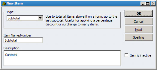 - Choose Subtotal from the Type list, and then assign an Item Name and Description, as shown in Figure 2.