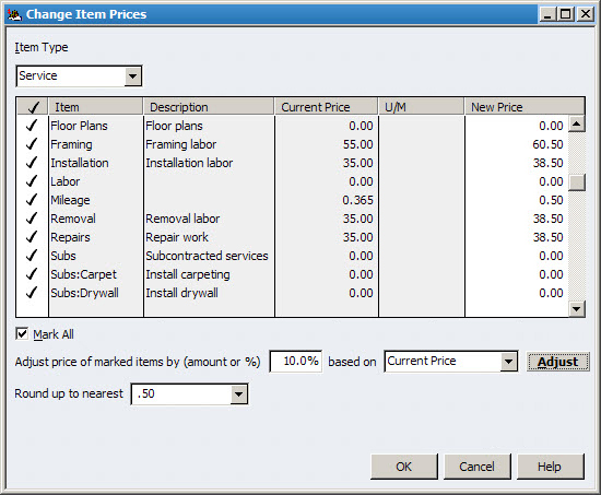 - Click the Adjust button to see the impact of your changes in the New Price column, and then click OK to make the changes permanent.