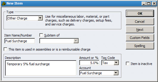Important: As with discounts, Other Charge items only apply to the preceding row on an invoice or sales receipt. Be sure to add a Subtotal item to your invoice if you want the surcharge to apply to multiple rows of your invoice or sales receipt.