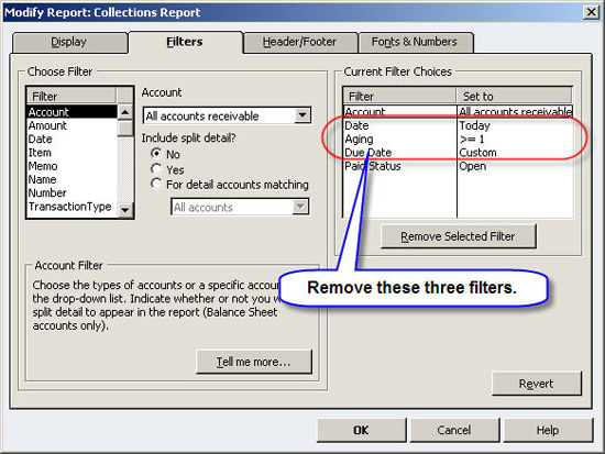 As shown in Figure 7, click on the Date filter, and then choose Remove Selected Filter. Do the same for the Aging and Due Date filters, and then click OK.