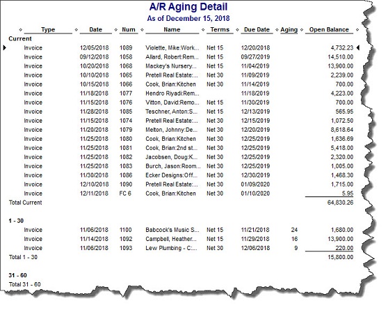 Figure 1: By running the A/R Aging Detail report, you can see whether you need to follow up with customers who have past due invoices.