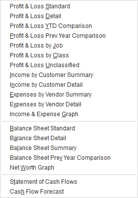 Figure 2: If you access QuickBooks reports through the Report Center, you’ll have several related options.