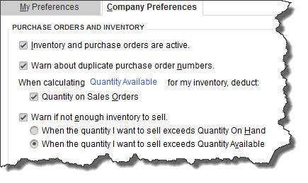 First, of course, click in the box to the left of Inventory and purchase orders are active if it is not already checked. Click the next box down if applicable. The rest of this window deals with two concepts you need to understand. Quantity on Hand refers to the number of items that you actually have. Quantity Available subtracts items currently on Sales Orders. QuickBooks will warn you if you do not have enough of a specific item to commit to a customer. You just have to decide which definition of Quantity you want to use.