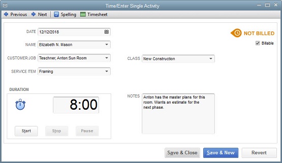 Figure 1: QuickBooks helps you create records for individual activities completed by employees, which can be either billable or unbillable.