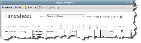 If you've entered all of the hours individually for an employee in a given time period, the timesheet should be correct when you click through from the Time/Enter Single Activity box. If not, you can edit cells by clicking in them and changing the data. Be sure that the Billable box is checked or unchecked correctly.