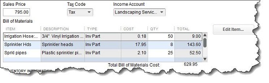 Figure 2: Enter the item name and quantity for every inventory part in your assembly, and QuickBooks will fill in the rest and calculate your total cost.