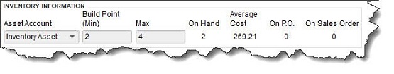 When you've completed the table for your assembly, enter the Total Bill of Materials Cost in the Cost field above it, then supply the Sales Price that you will charge. Select the correct Tax Code and Income Account. Then go down to the bottom of the screen under Inventory Information and select the appropriate Asset Account. You'll also need to specify at what point new assemblies should be built (minimum and maximum). There are four other fields on this line that QuickBooks will fill out once you start building assemblies and selling them.