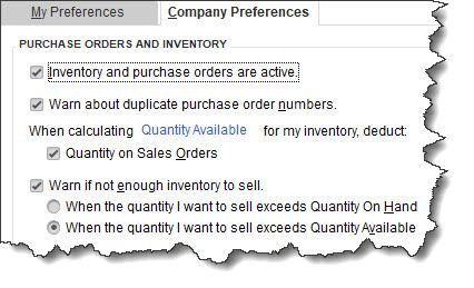 Before you can start working with assemblies, check your QuickBooks settings to make sure they're correct. Open the Edit menu and select Preferences, then Items & Inventory | Company Preferences. Click on the box in front of Inventory and purchase orders are active it's not already checked. If you want QuickBooks to deduct the quantity of items that have already been entered on sales orders, check that box (we recommend this, so you're not selling items that have already been promised). Then make sure the button in front of When the quantity I want to sell exceeds Quantity Available is filled in, for the same reason.