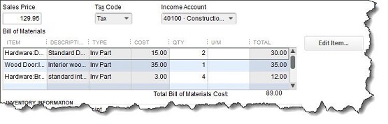 - Bill of Materials (BOM). This appears as a table in QuickBooks; it’s a list of all the individual inventory parts that make up the kit, along with their Cost (to you), QTY (quantity required for each assembly), and the total BOM Cost.