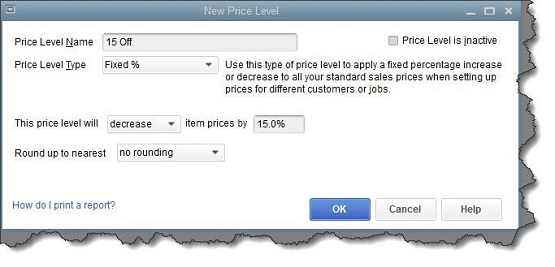 Fill in the field next to Price Level Name, and then click the arrow next to Price Level Type. Select Fixed %. Select decrease from the drop-down list on the next line and enter your percentage number. Round up to the nearest is an optional field, Click OK when you're done. The next time you create a sales transaction, your new price level will be available as an option when you open the drop-down list in the Rate column.