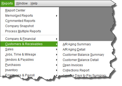 Unless you're working with a very old version of QuickBooks, you have two options for accessing the software's reporting functions. You can simply click on Reports in the left vertical pane to open the Report Center. Or you can get there by opening the Reports menu (which includes links to other areas, like the Transaction Journal, in addition to lists of QuickBooks' reports divided by category).