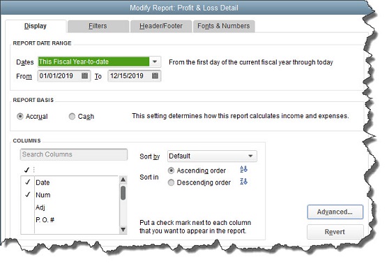 First, columns. Building reports from scratch would be too time-consuming and frustrating for you to do all of the time. And it's unnecessary, since QuickBooks provides templates for its reports, sets of columns and data filters that would serve some businesses well, but which can be modified by each user.
