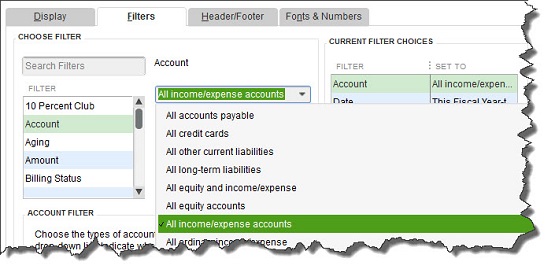 When you're done here, click on the Filters tab. This is a powerful element of QuickBooks report customization. You can limit your report output to data that meet certain criteria. In the image above, for example, you can tell QuickBooks which subset of Accounts should be included. Click on the Billing Status filter, and you can limit the results to Any, Not Billable, Unbilled, or Billed. You get the idea.