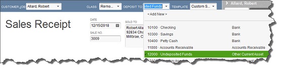 - In a specific bank account. QuickBooks lets you specify an individual account for each transaction. If you select this option, a box labeled DEPOSIT TO will appear on the Sales Receipt and Receive Payment screens. Select an account from the drop-down list, and your payment will be automatically deposited into it.