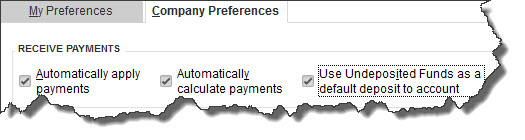 If you decide to have all payments sent to the Undeposited Funds account, you can establish that as your default. Open the Edit menu and select Preferences | Payments | Company Preferences. Then make sure that the box in front of Use Undeposited Funds as a default deposit to account is checked.
