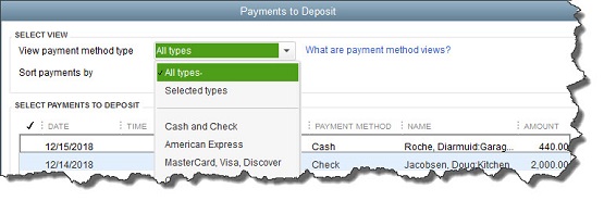 Figure 3: You can either view all of the unprocessed payments in Undeposited Funds in a single list, or you can display them by type.