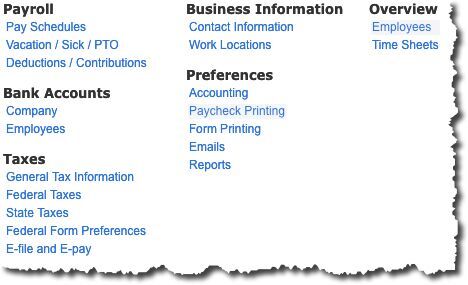 You would have entered information about your Contact Information and Work Locations (under the Business Information heading) when you first signed on to QuickBooks Online. At the same time, you would have been exposed to the Chart of Accounts, which already has accounts designated for payroll. You can see them by clicking Preferences | Accounting, but please do not customize these. If modifications are needed, we will do them for you.