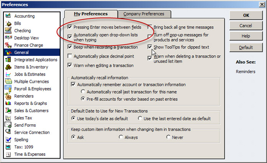 Typically you use the Tab key to move between fields, but it might be more efficient to change the setting and use the Enter key instead. To do so, choose Edit, Preferences, and then General. Select Pressing Enter Moves Between Fields, as shown in Figure 1. Keep in mind that if you change this setting, you’ll have to either press Ctrl-Enter to save a record, or navigate to the Save & New button and then press Enter. While setting that option, make sure to also choose Automatically open drop-down lists when typing. This will allow you to type the first couple letters of a list item, and then use the arrow keys and Enter key to choose the desired item.