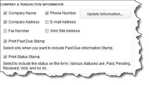 When you're done with fonts, you can choose Company and Transaction Information and indicate your preferences by checking and unchecking boxes. If you get a message warning you about overlapping fields, you will have to go into the Layout Designer, where you can drag and drop your form elements around to make them fit. This isn't particularly easy if you've never worked with a design tool before).