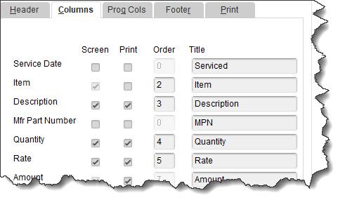 - Columns. Which columns should appear in the center of the invoice (Description, Quantity, Rate, etc.)?