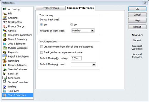 Before you start tracking time, you'll need to turn on the related tools. Click Edit | Preferences, and then Time & Expenses. Click on the tab titled Company Preferences. You'll see the window shown in Figure 1.