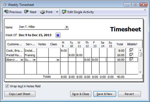 QuickBooks offers two ways to enter time. You can record hours on individual tickets or fill out weekly timesheets. No matter which you choose, the information is always available in the other form. You can switch methods at any time, and your work will be preserved.