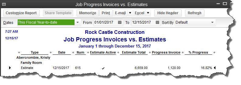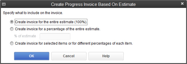 Click OK. QuickBooks will return to your progress invoice, which you can save and print or email to your customer. Your original estimate will remain unchanged.