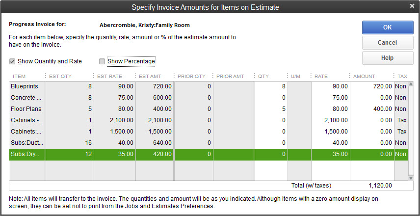In our example here, we're going to invoice the customer for two items, the blueprints and floor plans. So we selected the button next to Show Quantity and Rate and entered the full estimated quantity for each item in the QTY columns (if you chose Show Percentage, new columns would appear). It would look like this: