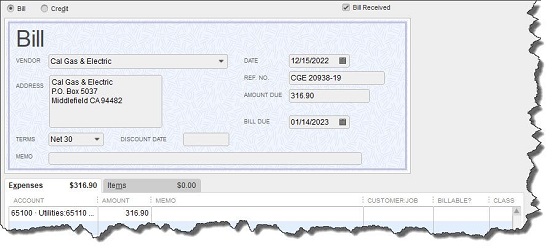If you set up default payment TERMS in that vendor's record, your preference should show in that field and the BILL DUE date should be correct. Enter the AMOUNT DUE and complete any of the optional fields that the transaction requires (REF. NO., DISCOUNT DATE, and MEMO).