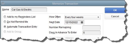 - Automate Transaction Entry. You can only select this if the transaction will be exactly the same every time (except for the date). If the number of transactions will be limited, enter the Number Remaining. And tell QuickBooks how many Days in Advance To Enter.
