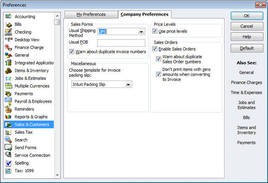 First, make sure that QuickBooks is set up to accommodate price levels. Click Edit | Preferences and select Sales & Customers in the left vertical pane. Then click the Company Preferences tab. You'll see the window shown in Figure 1.