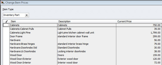 There are two ways to get to the price-changing window. You can click the Customers menu, then Change Item Prices. Or you can select the Items & Services icon from the home page. If you do the latter, simply open the Activities menu at the bottom of the screen and select Change Item Prices to see a window similar to the one shown in Figure 2.