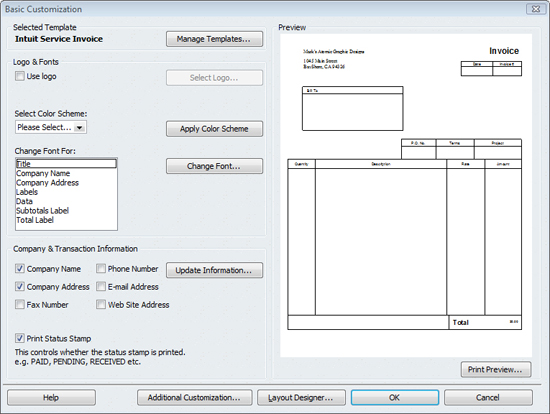 Select a template you want to start from, like the Intuit Service Invoice. Click the arrow in the Templates box, and a list of command options drops down. Click on Edit Template. The Basic Customization window opens, as shown in Figure 2.