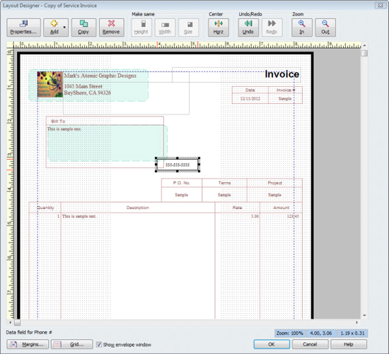 Templates are designed for use with Intuit's preprinted forms. So if you want to make additional changes, you'll have to make a copy of the form before doing so (which may or may not work with Intuit's forms). Click Manage Templates, and then click the Copy button. The program creates a modifiable copy of the template, which you can rename by replacing the text in the Template Name box. Click OK. As you make changes on the left side of the window, you'll see those modification reflected in the graphical representation of your invoice on the right.