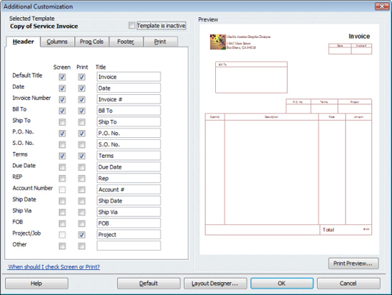 Click the Add button to insert text boxes, data fields, and images, and Copy and Remove to use those functions. Click OK when you're happy with your changes. This will take you back out to the Basic Customization window, where you can modify your invoice further. For example, you can click the Print Status Stamp box to have QuickBooks stamp your invoices with words like "PAID." Click the Additional Customization button to make other changes, as shown in Figure 4. By checking and unchecking default boxes under each tab, you can continue to change the appearance of your invoice.