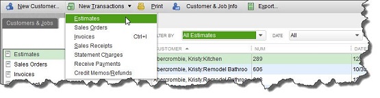 There are actually three ways to open an estimate form. You can click the Estimates icon on the home page or open the Customers menu and select Create Estimates. You can also open the Customer Center (Customers | Customer Center) and click on the Transactions tab. Click the New Transactions button in the toolbar and choose Estimates.