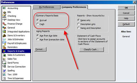 Figure 3: You can set either cash or accrual as your default report format.