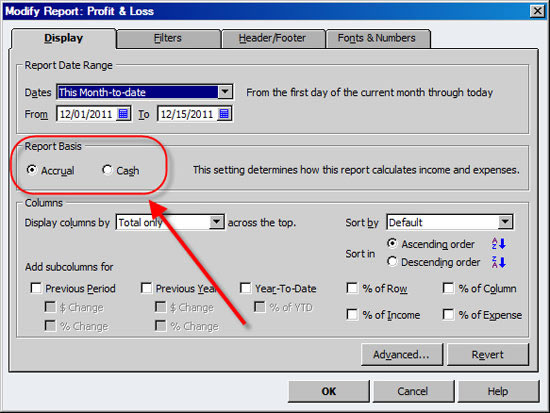 NOTE: Most, but not all, reports in QuickBooks allow you to change between cash and accrual. When a report is onscreen, choose Modify Report.