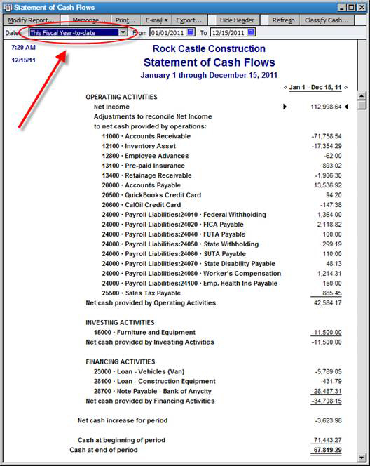 Let’s say that your cash balance at the beginning of your fiscal year was $100,000, and today it is $75,000. The net income figure on your P&L won’t give you the full details on why your cash balance decreased, but the Statement of Cash Flows will. To do so, choose Reports, Company & Financial, and then Statement of Cash Flows.