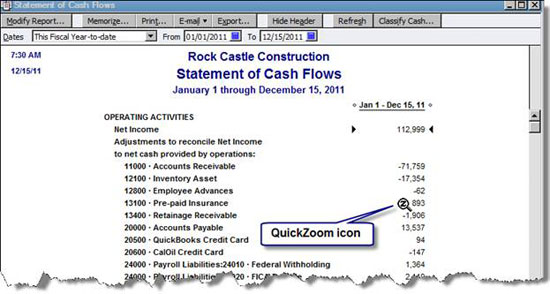 Research: You can easily investigate why amounts appear on your Statement of Cash Flows. As shown in Figure 6, the QuickZoom icon appears when you hover over an amount. Double-click to display a detailed report, as shown in Figure 7.