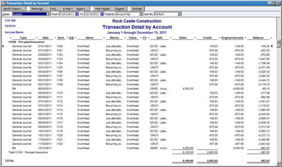 Figure 7: A detailed report appears when you double-click on an amount within a QuickBooks report.