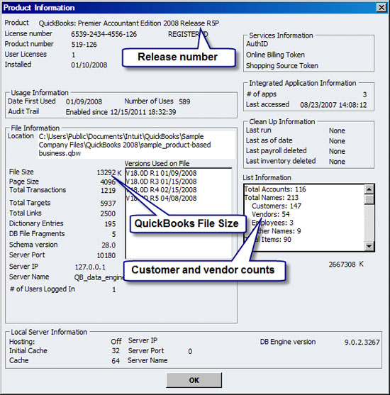 Each QuickBooks user in your office should have the same release number. The size and location of your QuickBooks file is shown in the File Information section, while you can use the List Information section to determine how many customers and vendors you have in QuickBooks.
