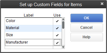 The process is similar to the one you used to define custom fields in your contact records. Open the Lists menu and select Item List (or Fixed Asset Item List where appropriate). Click Custom Fields in the dialog box that opens.