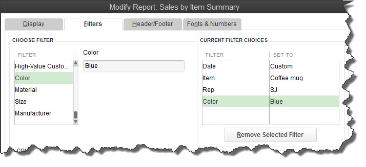 Let's say you wanted to find out how many blue coffee mugs Suzanne Jenkins sold in November. You'd proceed like you normally do when you're customizing a report, but you'd have to scroll down to the end of the Filter list to find the Color custom field that you created. You'd enter the word Blue in the field supplied. Your Sales by Item Summary report setup would look something like this: