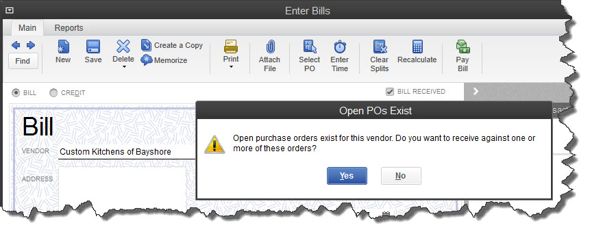 - Click OK. The Enter Bill screen opens, which can be processed like you’d handle any bill.