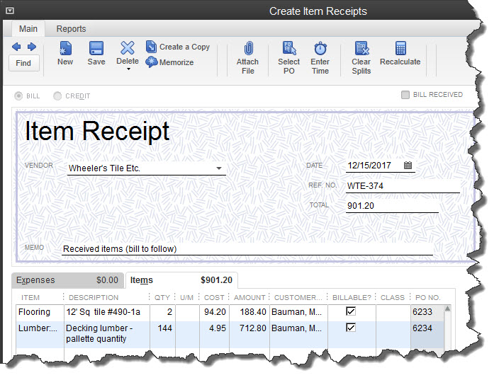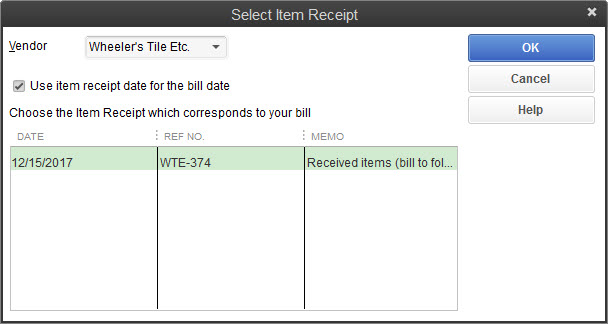 - Click Vendors | Enter Bill for Received Items, which opens the Select Item Receipt window.