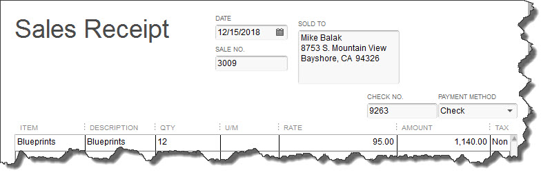 Figure 4: Fill out a sales receipt when payment is received simultaneously with the sale.
