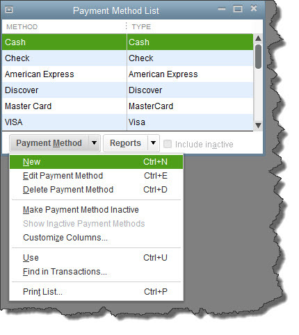 To make changes to this list, click the down arrow to the right of Payment Method. By selecting items from this menu, you can add, edit, and delete payment methods. You can also make one temporarily inactive if for some reason you're not going to support that option right now but don’t want to delete it, either. Click in the box next to Include Inactive if you want it to remain on the list (an X will appear next to it). When you want to reinstate it, open the Payment Method menu again and select Make Payment Method Active.