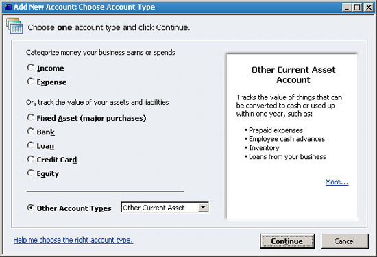- As shown in Figure 1, choose Other Account Type, Other Current Asset, and then click Continue.